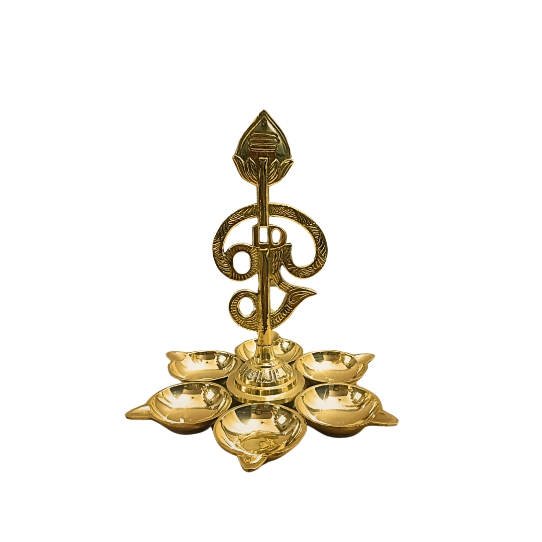 6-Inch Vel Arumuga Vilakku: Crafted in shining brass, this oil lamp is inspired by the Vel of Lord Murugan, believed to dispel negativity and invite divine protection.