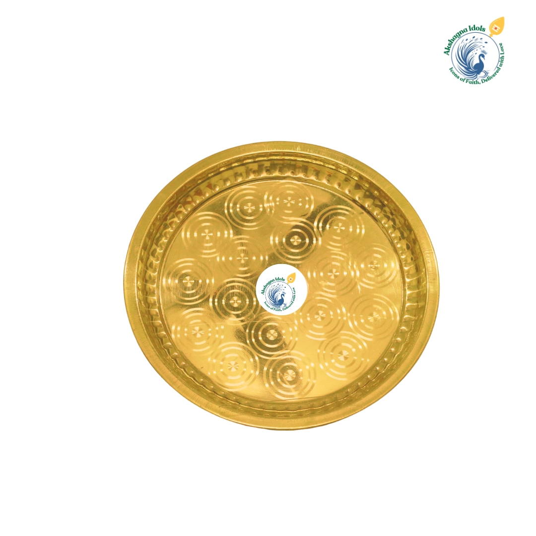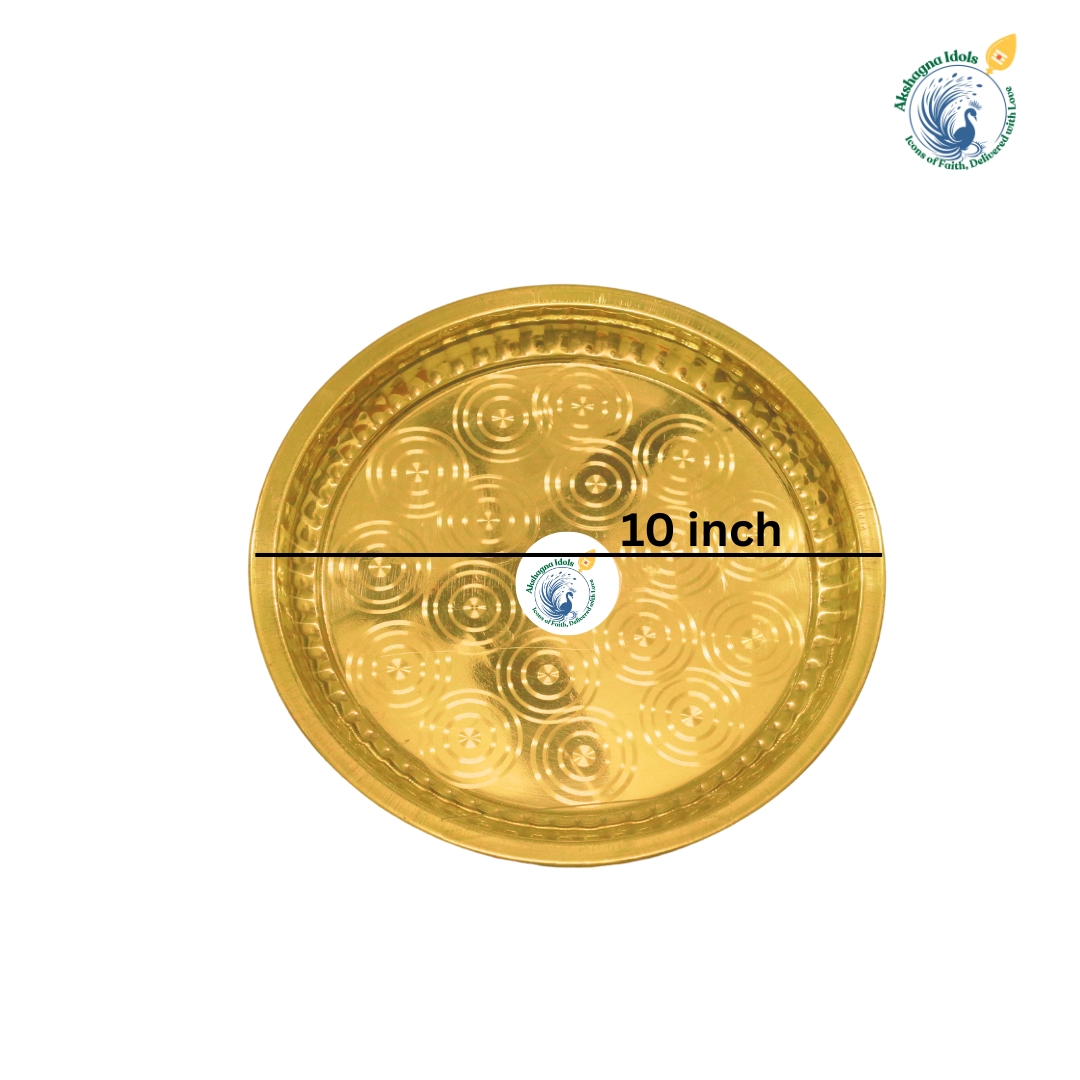 10-Inch Brass Pooja Plate: Spacious, durable, and polished to perfection—ideal for holding diya, flowers, incense, turmeric, kumkum, and other pooja essentials.