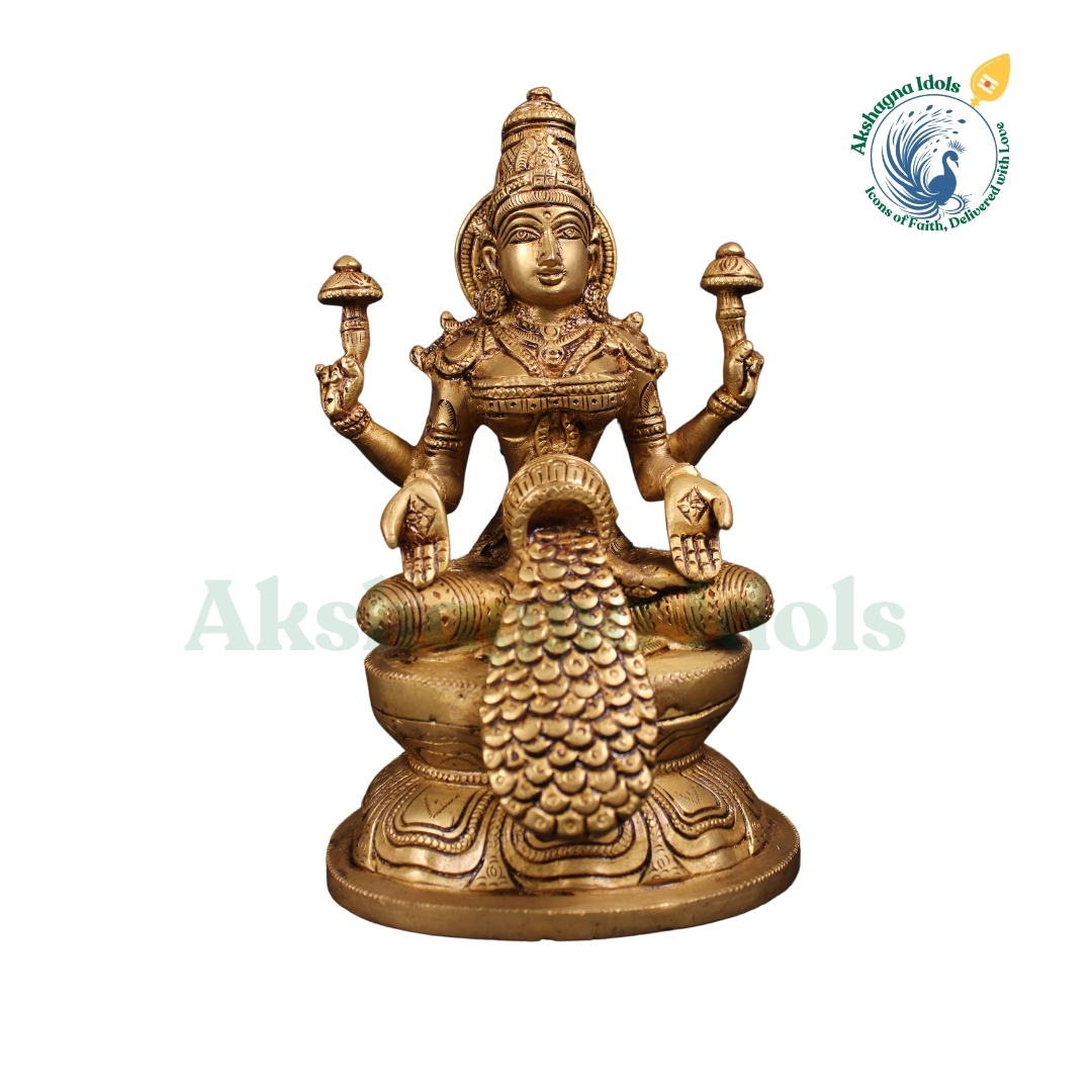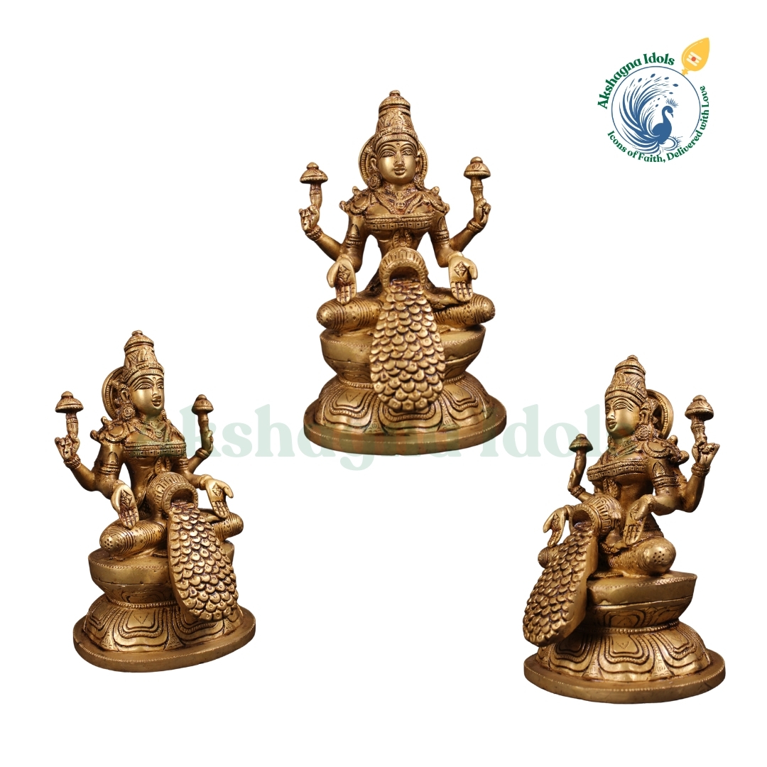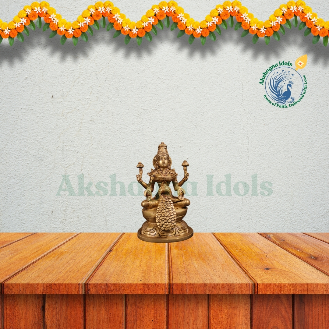 This exquisitely handcrafted Brass Swarna Lakshmi Idol represents Goddess Swarna Lakshmi, the bestower of wealth, prosperity, and divine abundance. Seated gracefully on a royal peacock throne, this idol exudes spiritual elegance and sacred energy, making it a perfect addition to home altars, temples, and meditation spaces.