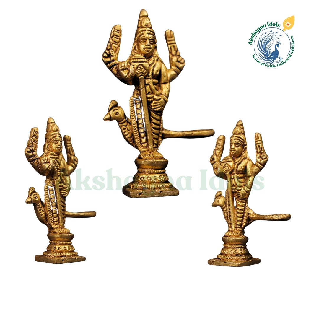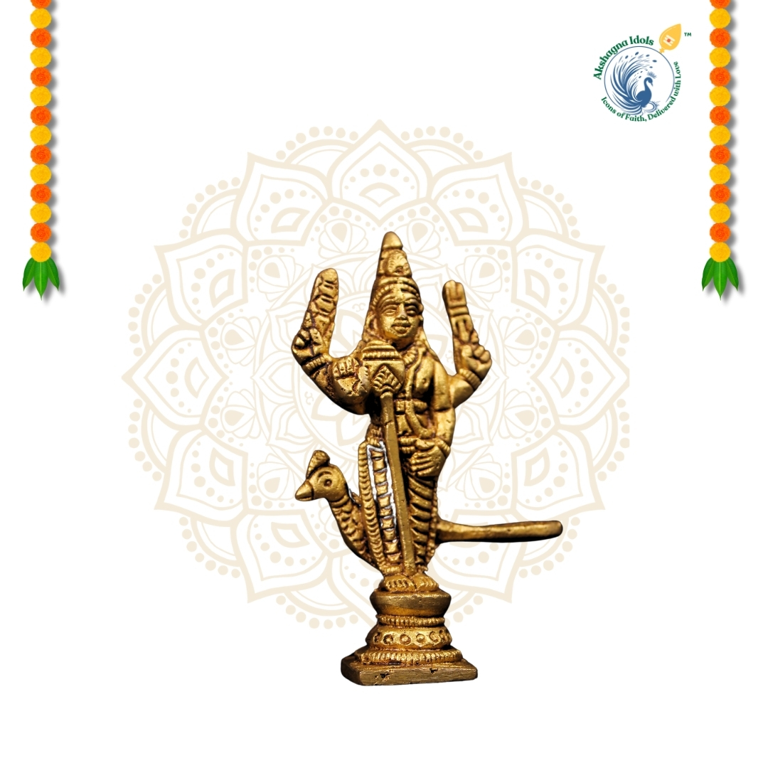This intricately handcrafted Brass Lord Murugan on Peacock Idol represents courage, wisdom, and divine protection. Lord Murugan, also known as Kartikeya or Subramanya, is revered as the warrior deity who removes obstacles, grants success, and blesses devotees with spiritual and material prosperity.