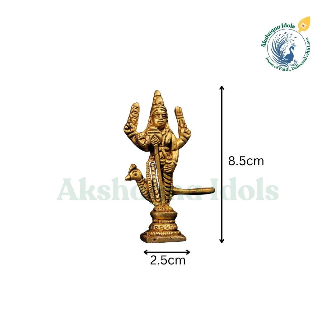 The idol depicts Lord Murugan standing gracefully with his sacred peacock mount (Mayil Vahanam), symbolizing power, grace, and righteousness. With fine detailing and an antique brass finish, this idol is perfect for home temples, puja spaces, and spiritual decor.